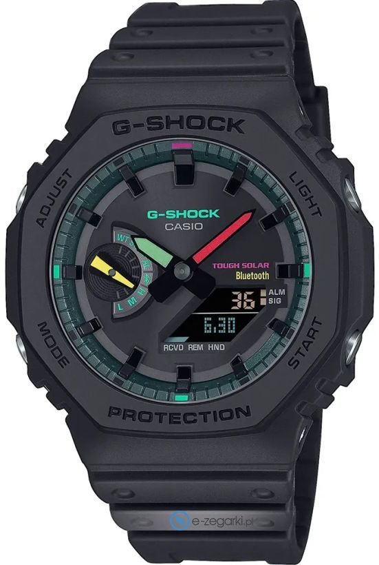 Zegarek GA-B2100MF-1AER posiada mechanizm solarny zasilany jakimkolwiek źródłem światła. Pasek koloru czarnego zrobiony jest z wysokiej jakości tworzywa sztucznego.
