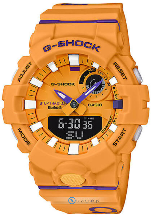 Wśród dodatkowych cech zegarka Casio GBA-800DG-9AER można wyróżnić bluetooth z pomocą którego sparujemy zegarek ze smartwatchem.