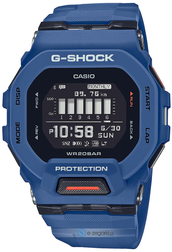 Casio GBD-200-2ER - męski zegarek przeznaczony dla osób szukających zegarka z serii Casio G-Shock. Niebanalny wygląd zegarka uzyskano również dzięki tarczy w kolorze czarnym. Aktualna godzina pokazywana jest w sposób cyfrowy co niezmiernie łatwo pozwala ją odczytać. Koperta w barwach koloru niebieskiego szeroka jest na 46 mm oraz ma grubość 15 mm - posiada prostokątny kształt.