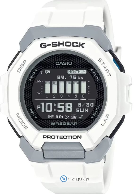 Model męski GBD-300-7ER z rodziny Casio G-Shock marki Casio. Niebanalny wygląd zegarka uzyskano również dzięki tarczy w kolorze czarnym. Zaprezentowana metodą cyfrową bieżąca godzina jest czytelna i łatwa do sprawdzenia. Koperta jest w kolorze białym szeroka jest na 47 mm oraz ma grubość 15 mm - w kształcie okrągłym.
