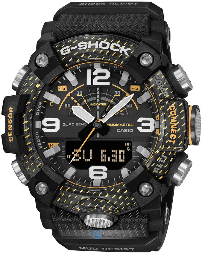 Zegarek męski GG-B100Y-1AER marki Casio z kolekcji Casio G-Shock. Charakterystyczny wygląd czasomierza osiągnięto także dzięki tarczy w kolorze czarnym. Zegarek ten prezentuje godzinę w formacie analogowo - cyfrowym dzięki czemu odczyt jest bezproblemowy. Koperta w barwach koloru czarnego szeroka jest na 53 mm oraz ma grubość 19.4 mm - w kształcie okrągłym.