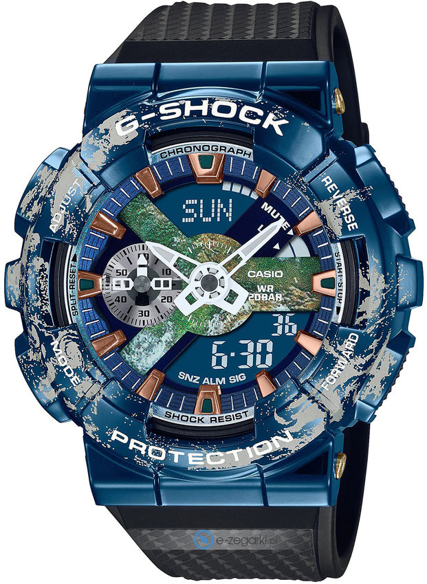 Męski zegarek GM-110EARTH-1AER z serii Casio G-Shock marki Casio to połączenie smaku oraz ciekawych funkcji. Ciekawy wygląd czasomierza osiągnięto także dzięki tarczy w kolorze niebieskim. Zegarek ten prezentuje aktualny czas w formacie analogowo - cyfrowym dzięki temu odczyt jest bezproblemowy. Koperta w odcieniach koloru niebieskiego szeroka jest na 48 mm oraz ma grubość 17 mm - wyróżnia się okrągłym kształtem.