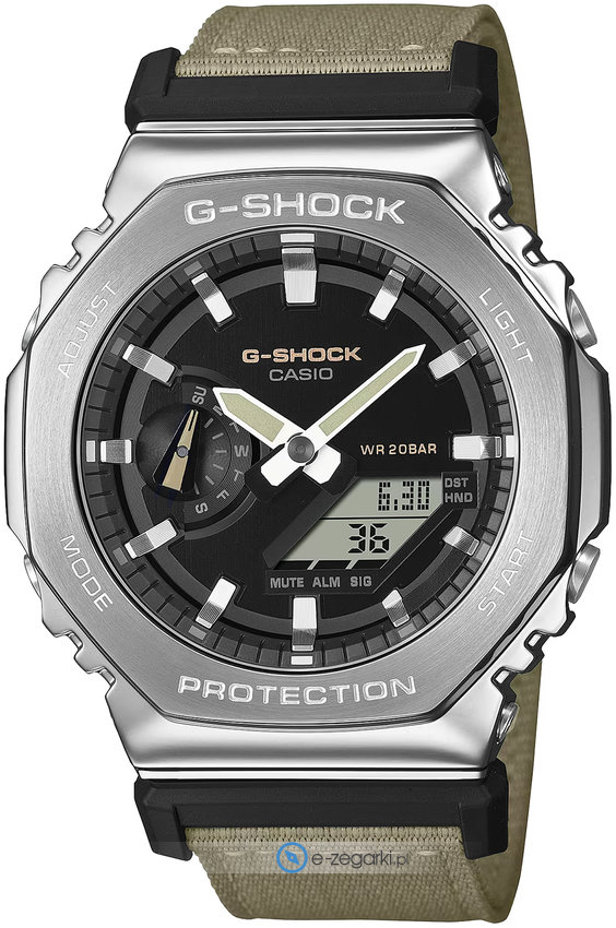 Model męski GM-2100C-5AER należy do serii Casio G-Shock marki Casio. Niestereotypowy wygląd zegarka osiągnięto również dzięki tarczy w kolorze szarym. Pokazana metodą analogowo - cyfrową aktualna godzina jest czytelna i szybka do sprawdzenia. Koperta w barwach koloru srebrnego szeroka jest na 44 mm oraz ma grubość 12 mm - charakteryzuje się okrągłym kształtem.
