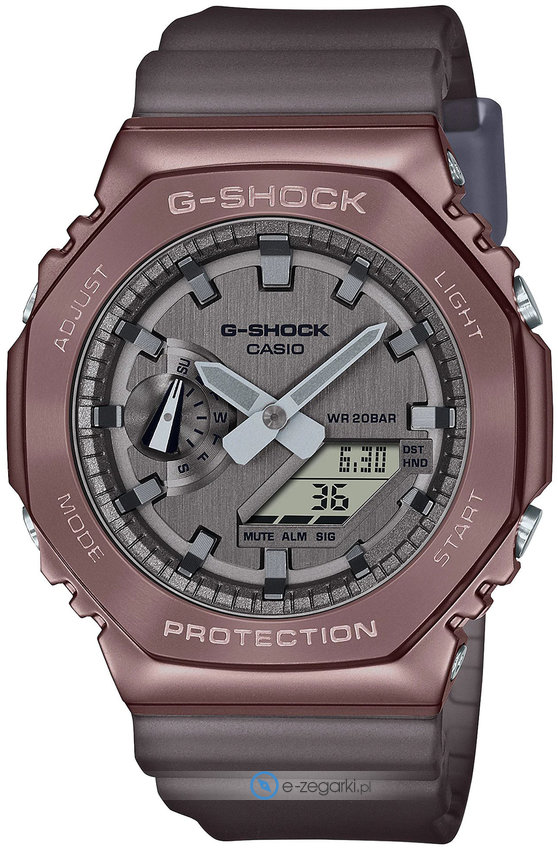 Męski zegarek GM-2100MF-5AER z serii Casio G-Shock marki Casio to połączenie estetyki i nieprzeciętnych funkcji. Charakteru nadaje wysokiej klasy tarcza w kolorze szarym. Zegarek ten prezentuje aktualny czas w formacie analogowo - cyfrowym dzięki czemu odczyt jest bezproblemowy. Koperta jest w kolorze różowo złotym szeroka jest na 44 mm oraz ma grubość 12 mm - w kształcie okrągłym.
