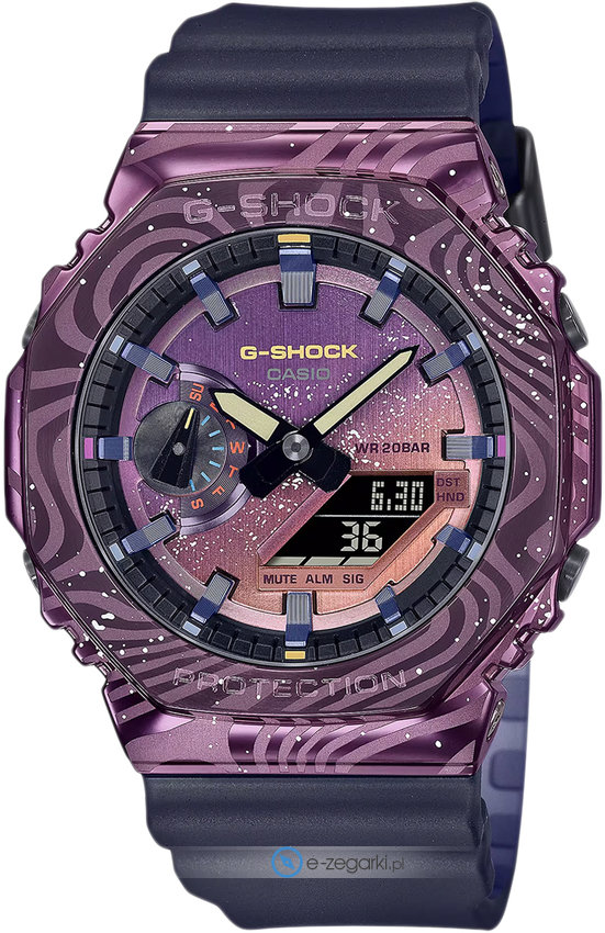 Model męski GM-2100MWG-1AER marki Casio z serii Casio G-Shock. Charakter zapewnia wysokiej jakości tarcza w kolorze fioletowym. Zaprezentowana metodą analogowo - cyfrową bieżąca godzina jest czytelna i prosta do sprawdzenia. Koperta w odcieniach koloru fioletowego szeroka jest na 44 mm oraz ma grubość 12 mm - w kształcie okrągłym.