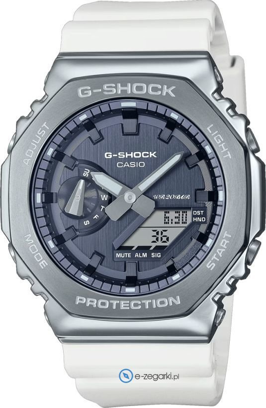 Zegarek GM-2100WS-7AER zasilany jest bateryjnie - ogniwo kwarcowe. Pasek białego koloru wykonany jest z wysokiej jakości tworzywa sztucznego.