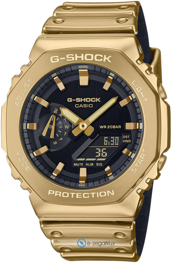 Zegarek GM-2100YMG-9AER marki Casio to stylowy zegarek naręczny męski, który jest wyposażony w pomysłowe rozwiązania i funkcje. Model ten zalicza się do kolekcji Casio G-Shock. Niebanalny wygląd zegarka osiągnięto m.in. poprzez cyferblat w kolorze czarnym. Zegarek ten prezentuje godzinę w formacie analogowo - cyfrowym dzięki czemu odczyt jest bezproblemowy. Koperta w odcieniach koloru złotego szeroka jest na 44 mm oraz ma grubość 12 mm - ma okrągły kształt.