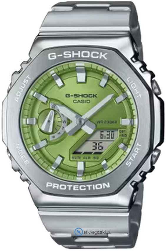 Zegarek męski GM-2110D-3AER z kolekcji Casio G-Shock marki Casio. Charakterystyczny wygląd zegarka osiągnięto również dzięki tarczy w kolorze zielonym. Zaprezentowana metodą analogowo - cyfrową aktualna godzina jest czytelna i szybka do odczytania. Koperta w barwach koloru srebrnego szeroka jest na 44 mm oraz ma grubość 11 mm.