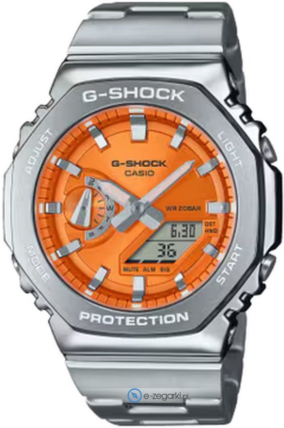 Casio GM-2110D-4AER to męski zegarek przeznaczony dla osób szukających zegarka z serii Casio G-Shock. Charakter zapewnia wysokiej jakości tarcza w kolorze pomarańczowym. Zegarek ten pokazuje godzinę w formacie analogowo - cyfrowym dzięki temu odczyt jest bezproblemowy. Koperta jest w kolorze srebrnym szeroka jest na 44 mm oraz ma grubość 11 mm.