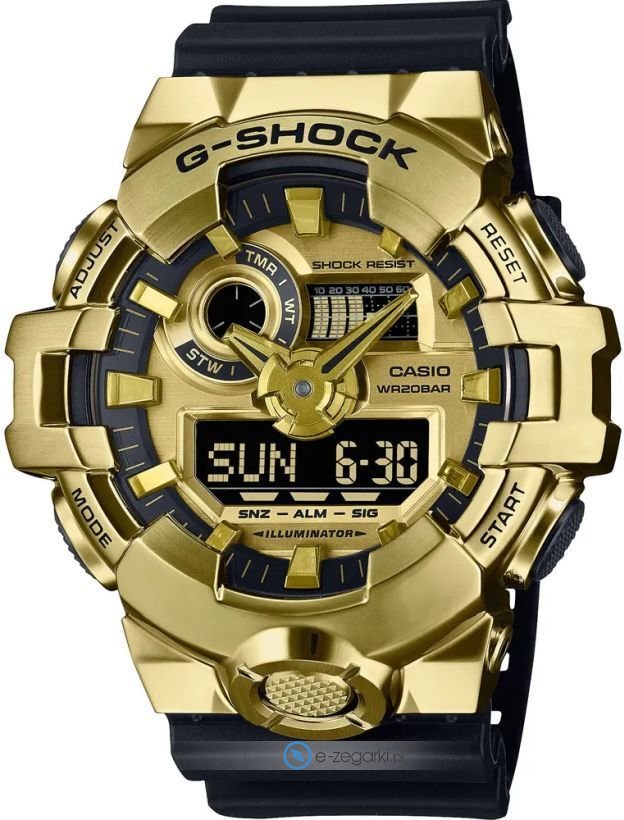 Zegarek męski GM-700G-9AER marki Casio należy do kolekcji Casio G-Shock. Charakteru dodaje wysokiej klasy cyferblat w kolorze czarnym. Godzina prezentowana jest w sposób analogowo - cyfrowy co niezmiernie łatwo pozwala ją odczytać. Koperta w barwach koloru złotego szeroka jest na 58 mm oraz ma grubość 58 mm - cechuje się okrągłym kształtem.