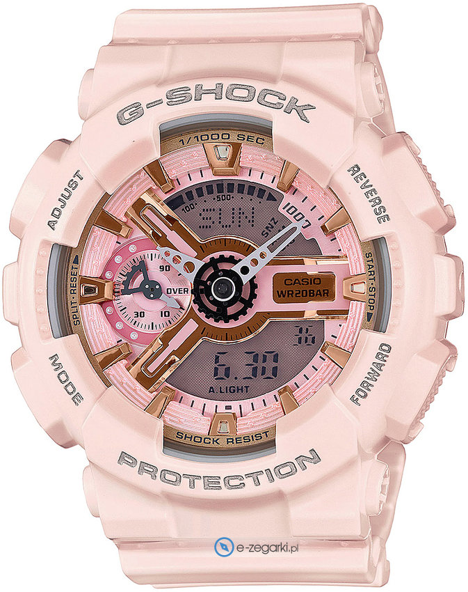 Zegarek męski GMA-S110MP-4A1ER marki Casio należy do rodziny Casio G-Shock. Zegarek ten prezentuje aktualny czas w formacie analogowo - cyfrowym dzięki temu odczyt jest intuicyjny. Koperta szeroka jest na 46 mm oraz ma grubość 13 mm.