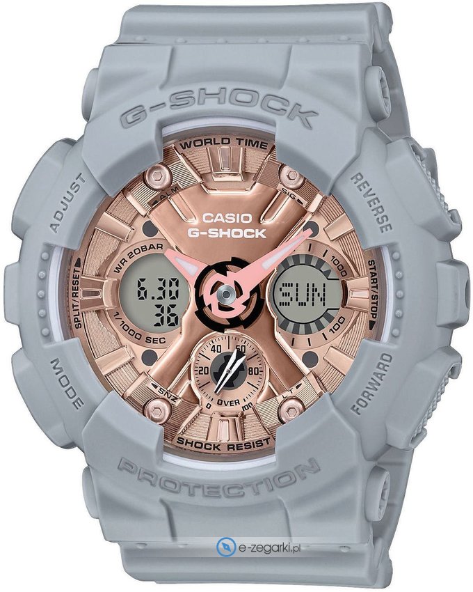Casio GMA-S120MF-8AER - męski zegarek przeznaczony dla osób szukających zegarka z rodziny Casio G-Shock. Pokazana metodą analogowo - cyfrową aktualna godzina jest czytelna i prosta do sprawdzenia. Koperta szeroka jest na 45.9 mm oraz ma grubość 15.8 mm.