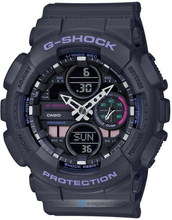 Casio GMA-S140-8AER - męski zegarek kierowany dla osób szukających zegarka z kolekcji Casio G-Shock. Niebanalny wygląd zegarka uzyskano również dzięki tarczy w kolorze ciemnym. Aktualna godzina zaprezentowana jest w sposób analogowo - cyfrowy co intuicyjnie pozwala ją odczytać. Koperta została ozdobiona kolorem czarnym szeroka jest na 46 mm oraz ma grubość 15.8 mm - w kształcie okrągłym.