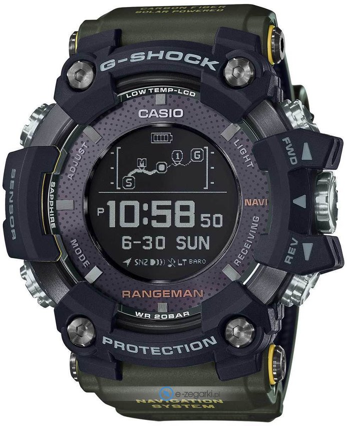 Zegarki Casio G-Shock Rangeman powstały z myślą o bardzo wymagających użytkownikach. Odporne praktycznie na wszystko (silne wstrząsy, duże ciśnienie wody, błoto, kurz, niska i wysoka temperatura), posiadają extra gumowe wzmocnienia konstrukcji jednocześnie bransolety i paska. G-Shock Rangeman to niedościgniona perła dla fanów długich oraz wymagających outdoorowych wypraw. Zegarek zapewnia dostęp do takich funkcji jak np.: barometr, termometr, stoper, timer, kalendarz oraz barometryczny kompas. Trzeba także dodać, że modele z serii Rangeman wykorzystują technologię solarną o nazwie Tough Solar - ogniwa rozmieszczone wokół wyświetlacza zmieniają energię słoneczną na elektryczną, która gwarantuje ciągłą pracę.