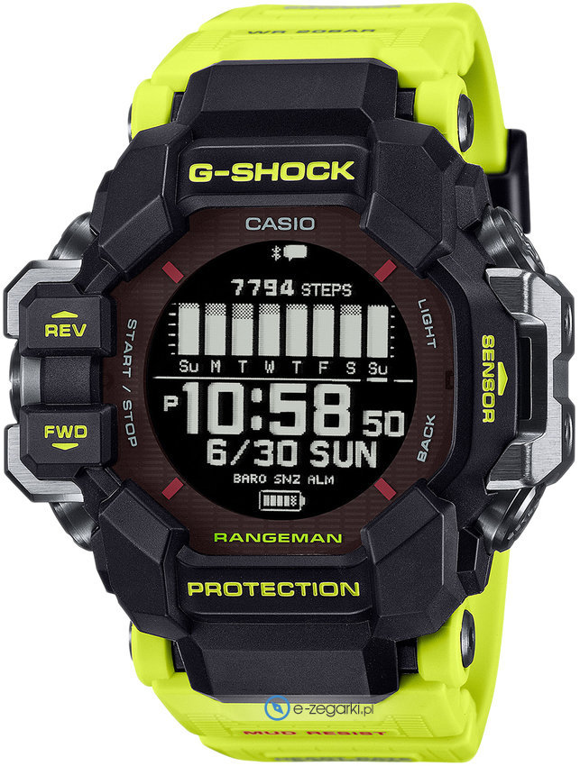 Dodatkowo model Casio GPR-H1000RY-1A9ER jest wyposażony w funkcje takie jak wysokościomierz pokazujący obecną wysokość nad poziomem morza, sterowanie GPS - szybkie aktualizowanie czasu i daty za pośrednictwem sygnałów z satelit jak również bluetooth z pomocą którego połączymy zegarek z telefonem.