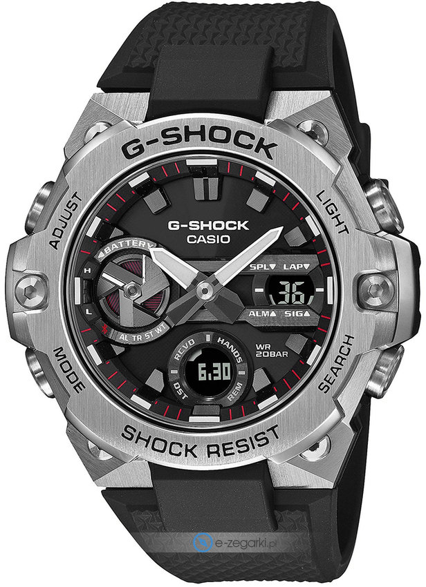 W zegarku GST-B400-1AER zastosowano mechanizm solarny zasilany jakimkolwiek źródłem światła. Pasek koloru czarnego wykonany jest z wysokiej jakości tworzywa sztucznego.