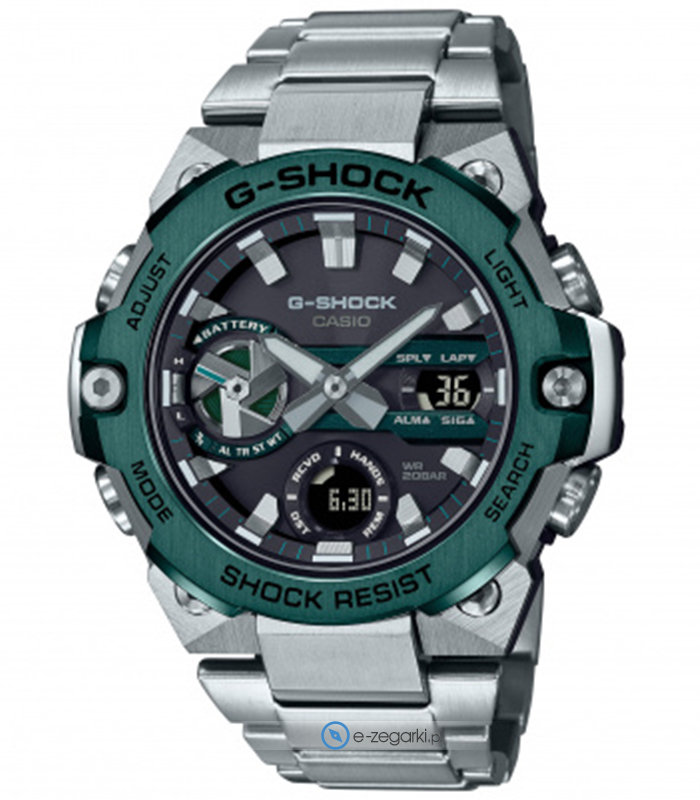 W zegarku GST-B400CD-1A3ER zastosowano mechanizm solarny zasilany jakimkolwiek źródłem światła. Odporna na korozję oraz działanie czynników atmosferycznych bransoleta srebrnego koloru cechuje się jakością, a także trwałością.