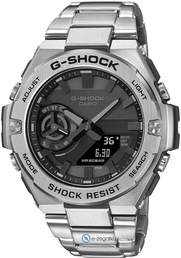 Zegarek męski GST-B500D-1A1ER marki Casio to dobre połączenie funkcjonalności i ciekawego designu. Model ten jest z serii Casio G-Shock. Charakterystyczną budowę czasomierza osiągnięto z pomocą tarczy w kolorze szarym. Godzina przedstawiona jest w sposób analogowo - cyfrowy co intuicyjnie pozwala ją odczytać. Koperta jest w kolorze srebrnym szeroka jest na 47 mm oraz ma grubość 13 mm - ma okrągły kształt.