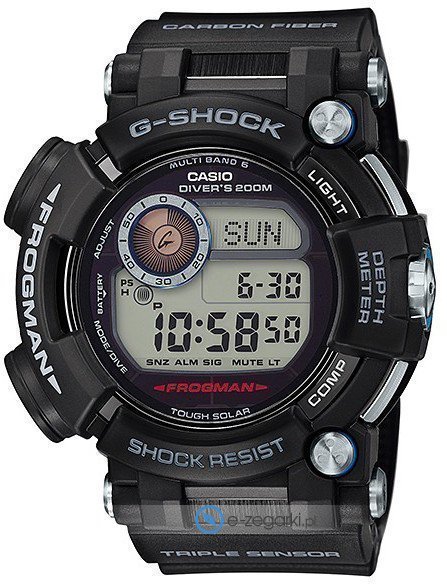Zegarki G-Shock Frogman to duży krok ewolucyjny marki G-Shock. Kierowana do entuzjastów nurkowania i pływania technicznego, zapewnia dokładny odczyt głębokości aż do 80m, a także kontroluje temperaturę w zakresie od -10 do 60 stopni Celcjusza. Dodatkowymi funkcjami czasomierza zapewniającymi niezawodność w trudnych okolicznościach są sensory wraz z modułami mierzącymi ciśnienie, kompas horyzontalny oraz opcja pozwalająca zapisać pomiary}. Dzięki wskaźnikowi pływów i faz księżyca Frogman pozwala określić idealną porę do nurkowania.