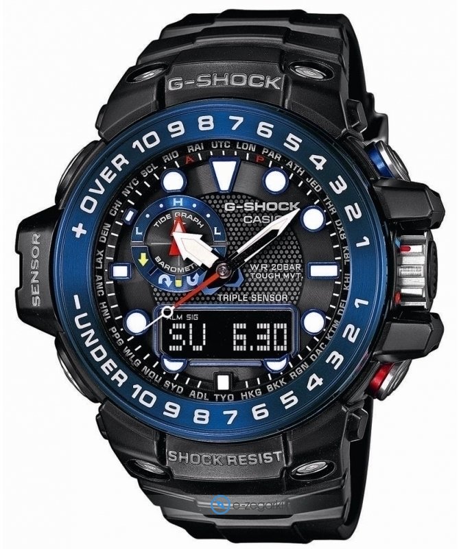 Oferta G-Shock Gulfmaster to seria stawiająca na sportowy image i obfitość funkcji dodatkowych. Zegarki Gulfmaster to czasomierze cechujące się przede wszystkim niekonwencjonalnym wyglądem oraz trzema modułami wytrzymałości - doskonałą wodoszczelnością, odpornością na wstrząsy oraz użyciem najwyższej jakości komponentów. Czasomierze te posiadają wszystkie podstawowe właściwości, powiększone o kompas, czas z podziałem na strefy czasowe, odczyt analogowo-cyfrowy, barometr, termometr, indykator faz księżyca, jak również autorskie solarne baterie. Warto nadmienić również o Waveceptor czyli synchronizacji czasu poprzez odbiornik radiowy oraz wskaźnik poziomu naładowania akumulatora, dzięki czemu chronometry należące do tej kolekcji są wstanie sprostać każdym warunkom i miejscom, w których będzie im dane funkcjonować.