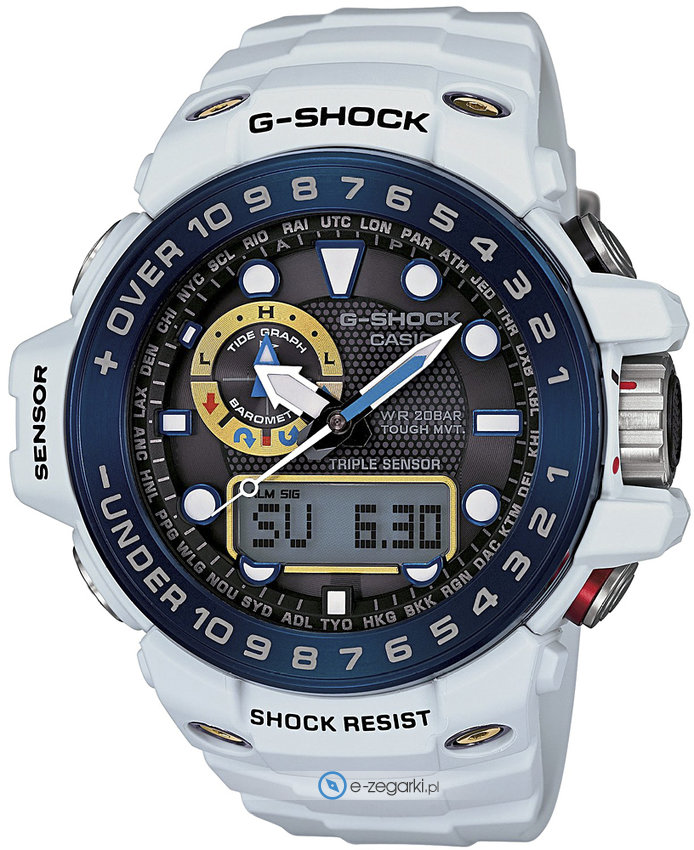Propozycja G-Shock Gulfmaster to seria stawiająca na sportowy charakter oraz multum opcji dodatkowych. Zegarki Gulfmaster to chronometry wyróżniające się przede wszystkim nieschematycznym kształtem oraz trzema segmentami odporności - doskonałą wodoszczelnością, odpornością na wstrząsy oraz zastosowaniem wytrzymałych elementów. Modele te zawierają wszystkie najważniejsze właściwości, rozbudowane o kompas, czas światowy, odczyt cyfrowo-analogowy, barometr, termometr, indykator faz księżyca, a także opatentowane solarne baterie. Warto dodać również o Waveceptor czyli kontroli czasu za pomocą fal radiowych jak również wskaźnik poziomu naładowania akumulatora, na skutek czego czasomierze z tej serii pozwalają podołać każdym okolicznościom i miejscom, w których będzie im dane funkcjonować.