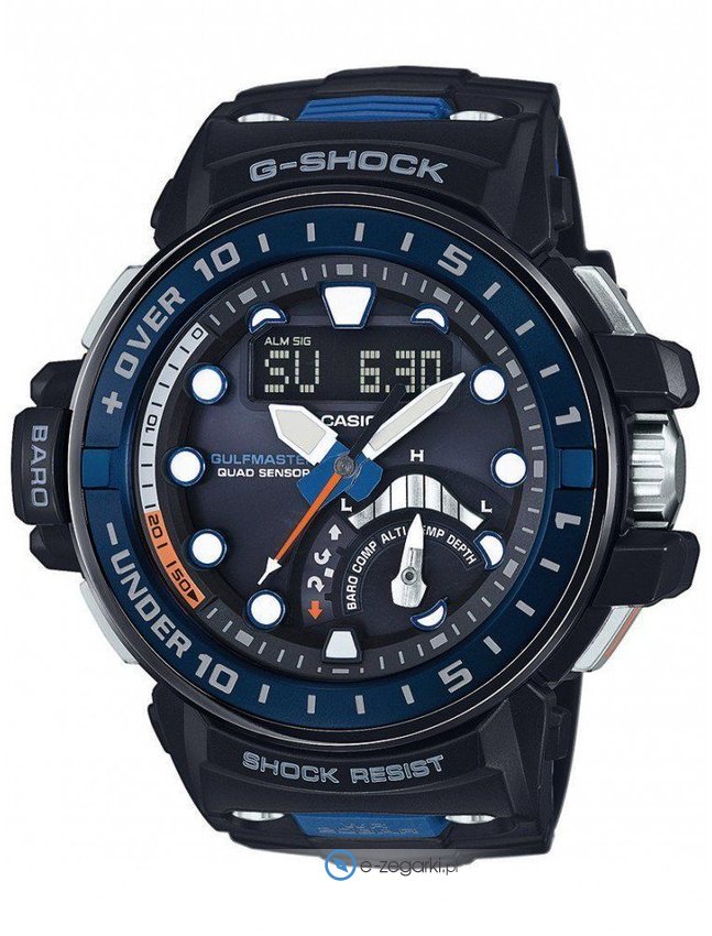 Oferta G-Shock Gulfmaster to seria stawiająca na sportowy wygląd i mnogość zadań dodatkowych. Zegarki Gulfmaster to chronometry wyróżniające się przede wszystkim innowacyjnym kształtem oraz trzema segmentami wytrzymałości - doskonałą wodoszczelnością, odpornością na wstrząsy oraz użyciem wytrzymałych komponentów. Modele te posiadają wszystkie najważniejsze właściwości, rozbudowane o cyfrowy kompas, czas światowy, odczyt cyfrowo-analogowy, barometr, termometr, wskaźnik faz księżyca, a także autorskie solarne zasilanie. Warto zaznaczyć również o Waveceptor czyli kontroli czasu poprzez odbiornik radiowy jak również wskaźnik poziomu naładowania akumulatora, dzięki czemu czasomierze należące do tej kolekcji są wstanie podołać każdym okolicznościom i miejscom, w których będzie im dane pracować.