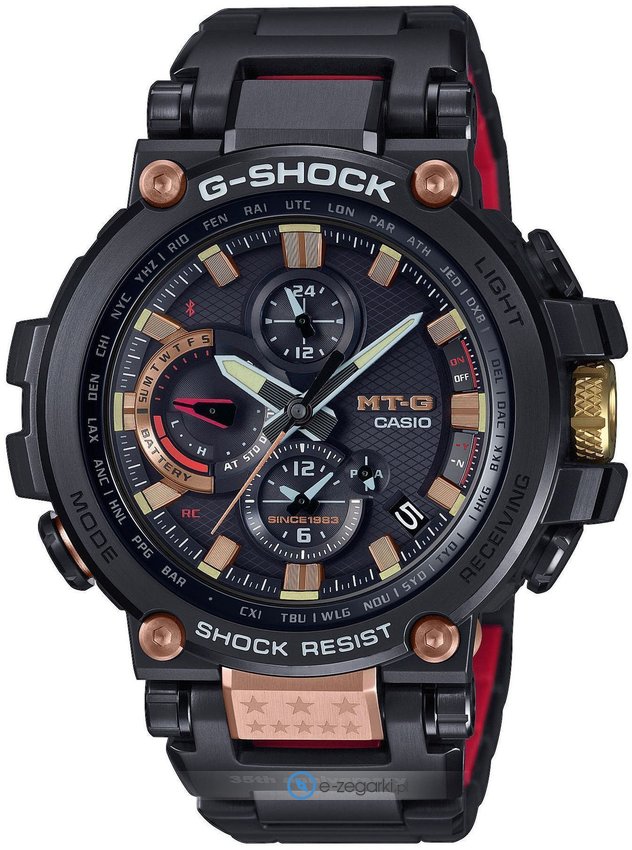 Zegarek męski MTG-B1000TF-1ADR marki Casio należy do serii Casio G-Shock. Zegarek ten pokazuje godzinę w formacie analogowym dzięki temu odczyt jest intuicyjny. Koperta szeroka jest na 51.7 mm oraz ma grubość 14.4 mm.