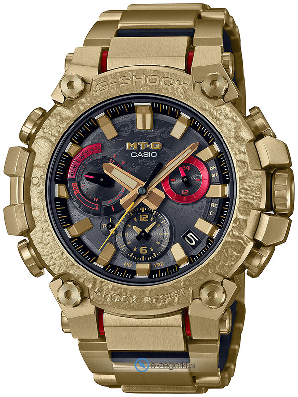 Zegarek męski MTG-B3000CX-9AER marki Casio należy do kolekcji Casio G-Shock. Charakteru dodaje wysokiej jakości tarcza w kolorze czarnym. Zegarek ten pokazuje godzinę w formacie analogowym dzięki czemu odczyt jest intuicyjny. Koperta jest pokryta kolorem złotym szeroka jest na 52 mm oraz ma grubość 12 mm - posiada okrągły kształt.