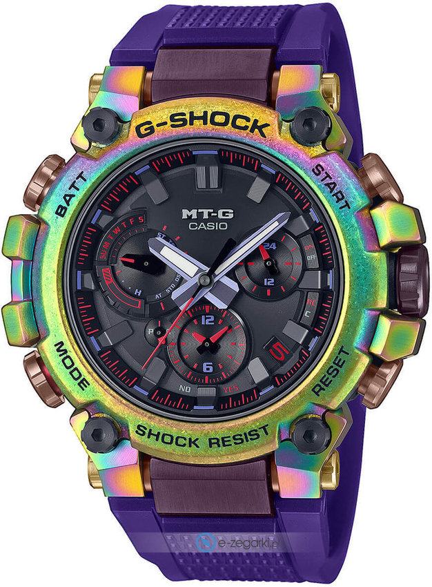 Zegarek MTG-B3000PRB-1AER posiada mechanizm solarny zasilany dowolnym źródłem światła. Pasek w tonacji koloru fioletowego zrobiony jest z wysokiej jakości tworzywa sztucznego.