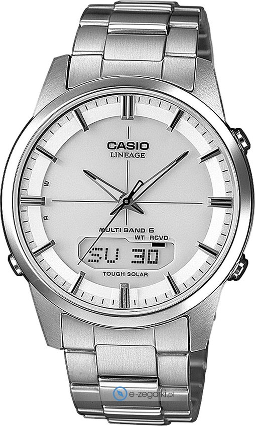 Zegarek LCW-M170TD-7AER marki Casio to gustowny zegarek naręczny męski, który posiada ciekawe rozwiązania i funkcje. Model ten zalicza się do kolekcji Casio Lineage. Charakteru nadaje wysokiej klasy tarcza w kolorze białym. Zegarek ten pokazuje aktualny czas w formacie analogowo - cyfrowym dzięki czemu odczyt jest bezproblemowy. Koperta jest w kolorze srebrnym szeroka jest na 39 mm oraz ma grubość 9 mm - w kształcie okrągłym.
