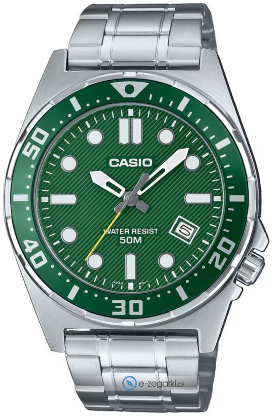 Męski zegarek Casio MTD-135D-3A to zegarek, który dzięki swemu wzornictwu zawsze będzie prezentował się dobrze. Ciekawy wygląd czasomierza osiągnięto także dzięki tarczy w kolorze zielonym. Zaprezentowana metodą analogową aktualna godzina jest czytelna i łatwa do sprawdzenia. Koperta szeroka jest na 50 mm oraz ma grubość 50 mm - w kształcie okrągłym.