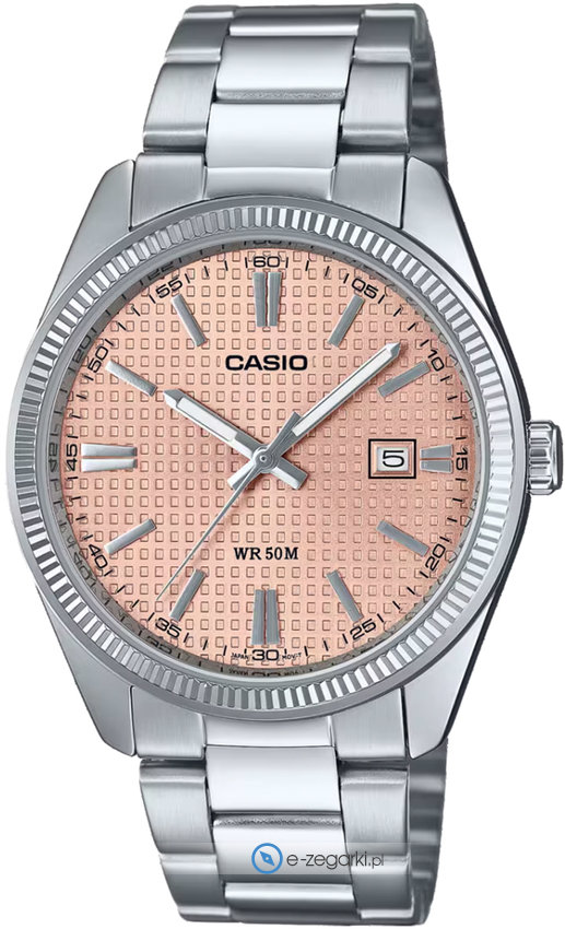 Zegarek męski MTP-1302PE-4AVEF marki Casio to stylowe połączenie funkcjonalności i modnego wzornictwa. Charakter zapewnia wysokiej jakości cyferblat w kolorze różowym. Godzina prezentowana jest w sposób analogowy co intuicyjnie pozwala ją odczytać. Koperta jest w kolorze srebrnym szeroka jest na 38 mm oraz ma grubość 10 mm - posiada okrągły kształt.