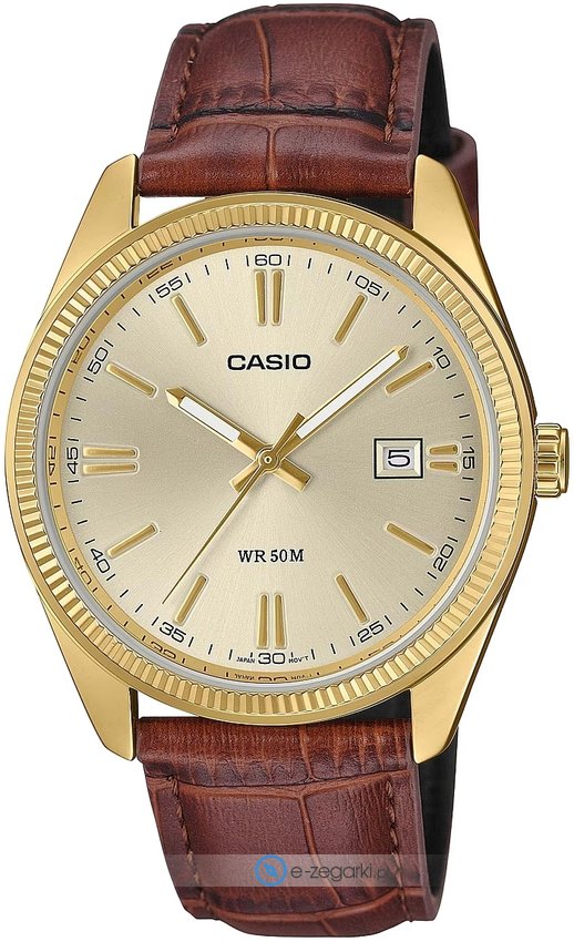 Męski zegarek Casio MTP-1302PGL-9AVEF to zegarek, który dzięki swemu wzornictwu zawsze będzie prezentował się dobrze. Nieschematyczny wygląd zegarka uzyskano także dzięki tarczy w kolorze złotym. Zaprezentowana metodą analogową aktualna godzina jest czytelna i łatwa do odczytania. Koperta w barwach koloru złotego szeroka jest na 38 mm oraz ma grubość 10 mm - w kształcie okrągłym.