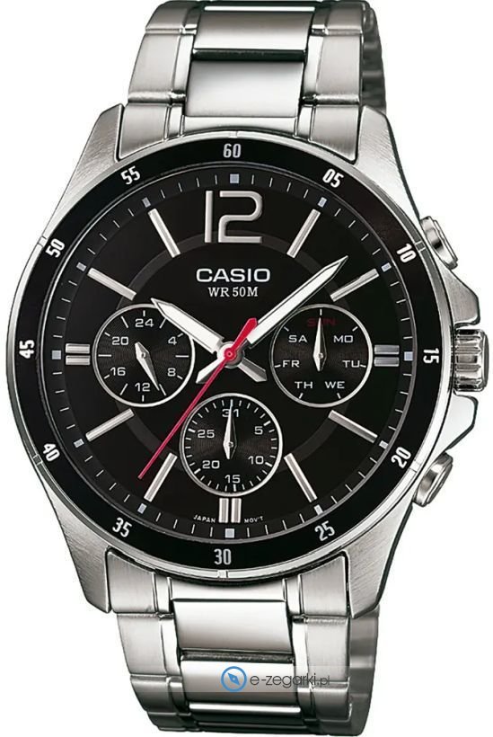Model MTP-1374PD-1AVEF marki Casio to stylowy zegarek naręczny męski, który posiada pomysłowe rozwiązania i funkcje. Cyferblat zegarka jest w kolorze czarnym. Godzina przedstawiona jest w sposób analogowy co intuicyjnie pozwala ją odczytać. Koperta jest w kolorze srebrnym szeroka jest na 43 mm oraz ma grubość 11 mm - w kształcie okrągłym.