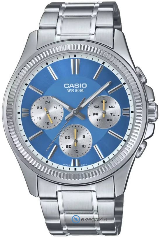 Zegarek męski MTP-1375PD-2A2VEF marki Casio to dobre połączenie funkcjonalności oraz ciekawego designu. Niebanalną konstrukcję czasomierza osiągnięto z pomocą tarczy w kolorze niebieskim. Zaprezentowana metodą analogową bieżąca godzina jest czytelna i szybka do odczytania. Koperta jest w kolorze srebrnym szeroka jest na 44 mm oraz ma grubość 11 mm - w kształcie okrągłym.