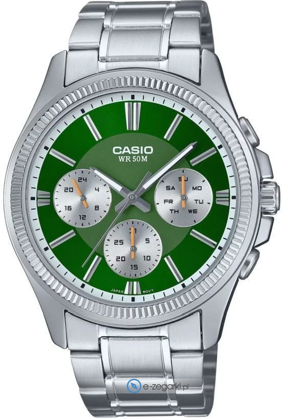 Męski zegarek Casio MTP-1375PD-3AVEF to zegarek, który dzięki swemu wzornictwu zawsze będzie prezentował się dobrze. Stylu dodaje wysokiej klasy cyferblat w kolorze zielonym. Zaprezentowana metodą analogową bieżąca godzina jest czytelna i prosta do sprawdzenia. Koperta jest ozdobiona kolorem srebrnym szeroka jest na 44 mm oraz ma grubość 11 mm - w kształcie okrągłym.