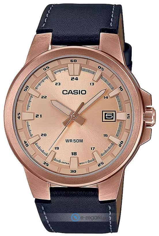 Zegarek męski MTP-E173RL-5AVEF marki Casio to dobre połączenie funkcjonalności i modnego wzornictwa. Ciekawą stylistykę zegarka uzyskano z pomocą tarczy w kolorze różowo złotym. Aktualna godzina zaprezentowana jest w sposób analogowy co bez trudu pozwala ją odczytać. Koperta jest ozdobiona kolorem różowo złotym szeroka jest na 42 mm oraz ma grubość 9 mm - w kształcie okrągłym.