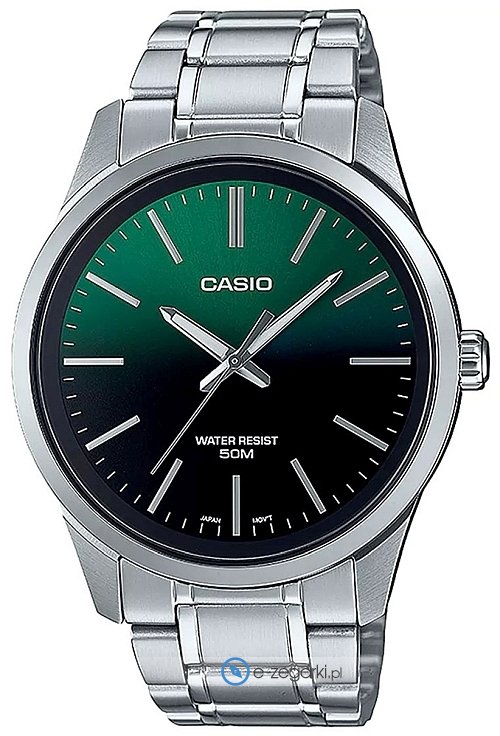 Model MTP-E180D-3AVEF marki Casio to gustowny zegarek naręczny męski, który posiada ciekawe rozwiązania oraz funkcje. Ciekawy wygląd czasomierza uzyskano m.in. poprzez cyferblat w kolorze zielonym. Zaprezentowana metodą analogową aktualna godzina jest czytelna i prosta do sprawdzenia. Koperta jest w kolorze srebrnym szeroka jest na 42 mm oraz ma grubość 8 mm - posiada okrągły kształt.