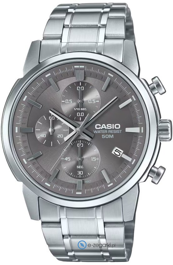 Zasilanie zegarka MTP-E510D-8AVDF zapewnia standardowa bateria kwarcowa. Bransoleta w kolorze szarym, wykonana ze stali nierdzewnej odpornej na korozję i czynniki atmosferyczne, gwarantuje trwałość i komfort noszenia. Model ten wyposażono w szkiełko mineralne, które skutecznie chroni tarczę przed zarysowaniami. Wodoszczelność klasy WR 50 umożliwia krótkotrwałe zanurzenie zegarka, na przykład podczas mycia rąk.