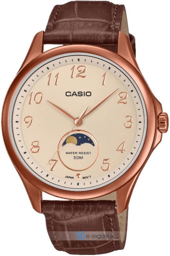 Model MTP-M110RL-5AVER marki Casio to idealny wybór dla mężczyzn ceniących niezawodność i funkcjonalność. Ten stylowy zegarek naręczny łączy w sobie japońską niezawodność z nowoczesnym designem. Godzina prezentowana w sposób analogowy zapewnia czytelność i klasyczny wygląd. Koperta w kolorze różowego złota o szerokości 48 mm i grubości 10 mm nadaje zegarkowi wyrazistości na męskim nadgarstku.