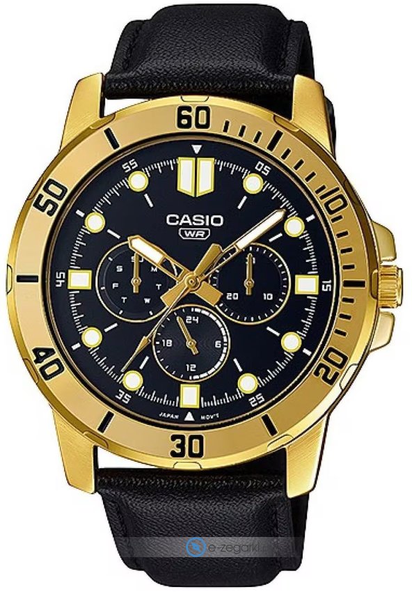Zegarek MTP-VD300GL-1EUD wyposażony jest w mechanizm kwarcowy zasilany baterią. Pasek wykonany z wysokiej jakości skóry w kolorze czarnym zapewnia trwałość i komfort noszenia. Koperta ze stali nierdzewnej gwarantuje odporność na korozję i działanie czynników atmosferycznych. Szkiełko mineralne chroni zegarek przed zarysowaniami podczas codziennego użytkowania. Wodoszczelność na poziomie WR 30 zapewnia ochronę przed drobnymi zamoczeniami, np. podczas mycia rąk. Zegarek objęty jest dwuletnią gwarancją producenta.