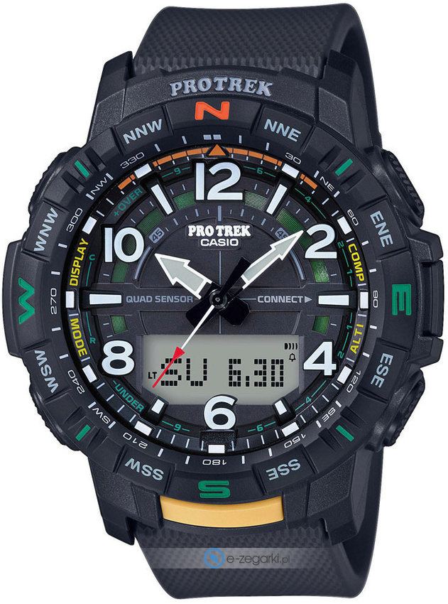 Męski zegarek PRT-B50-1ER z serii Casio Protrek marki Casio to połączenie estetyki oraz pomysłowych funkcji. Aktualna godzina pokazywana jest w sposób cyfrowy co niezmiernie łatwo pozwala ją odczytać. Koperta szeroka jest na 50.8 mm oraz ma grubość 15.58 mm - charakteryzuje się okrągłym kształtem.