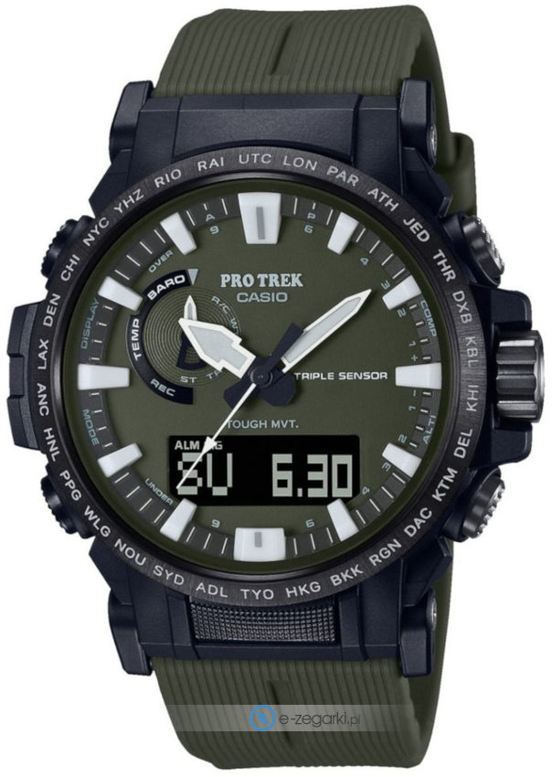 Męski zegarek PRW-61Y-3ER z serii Casio Protrek marki Casio to połączenie estetyki i ciekawych funkcji. Charakterystyczną budowę czasomierza uzyskano dzięki tarczy w kolorze zielonym. Zegarek ten pokazuje aktualny czas w formacie analogowo - cyfrowym dzięki temu odczyt jest intuicyjny. Koperta w barwach koloru czarnego szeroka jest na 54.2 mm oraz ma grubość 54.2 mm - charakteryzuje się okrągłym kształtem.