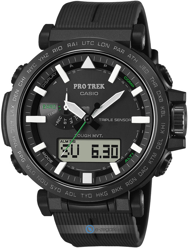 Casio PRW-6621Y-1ER to męski zegarek przeznaczony dla osób szukających zegarka z kolekcji Casio Protrek. Niestereotypowy wygląd czasomierza osiągnięto m.in. poprzez cyferblat w kolorze czarnym. Zegarek ten prezentuje aktualny czas w formacie analogowo - cyfrowym dzięki czemu odczyt jest bezproblemowy. Koperta jest ozdobiona kolorem czarnym szeroka jest na 51 mm oraz ma grubość 15 mm - w kształcie okrągłym.
