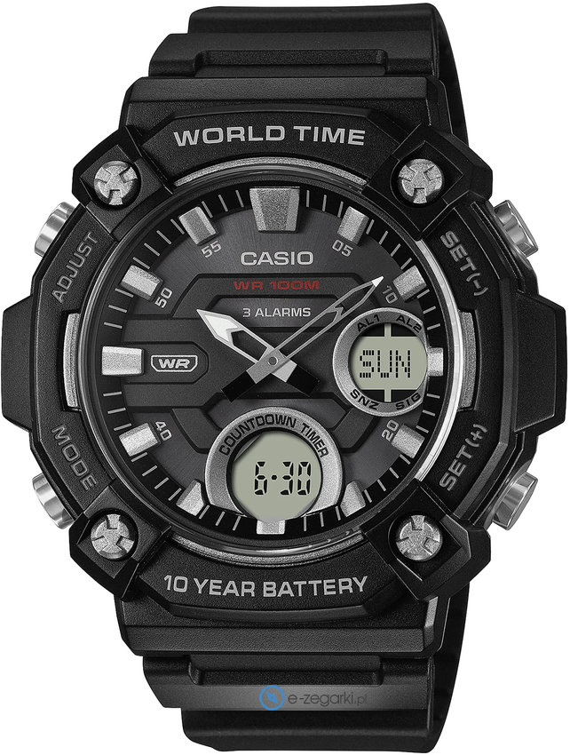 Zegarek AEQ-120W-1AVEF posiada kwarcowy mechanizm zasilany standardową baterią. Pasek koloru czarnego zrobiony jest z wysokiej jakości tworzywa sztucznego.