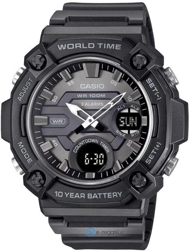 Zegarek AEQ-120W-1B wyposażony jest w mechanizm zasilany klasyczną baterią kwarcową. Pasek koloru czarnego zrobiony jest z wysokiej jakości tworzywa sztucznego.