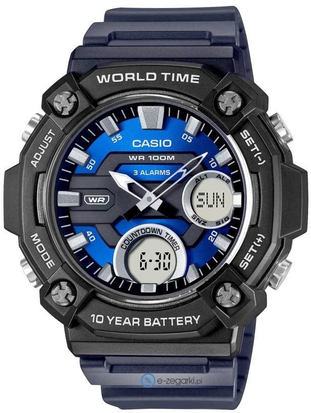 Kwarcowa bateria zamontowana w modelu AEQ-120W-2A zapewnia zasilanie jego mechanizmu. Pasek w odcieniach koloru niebieskiego zrobiony jest z wysokiej jakości tworzywa sztucznego.