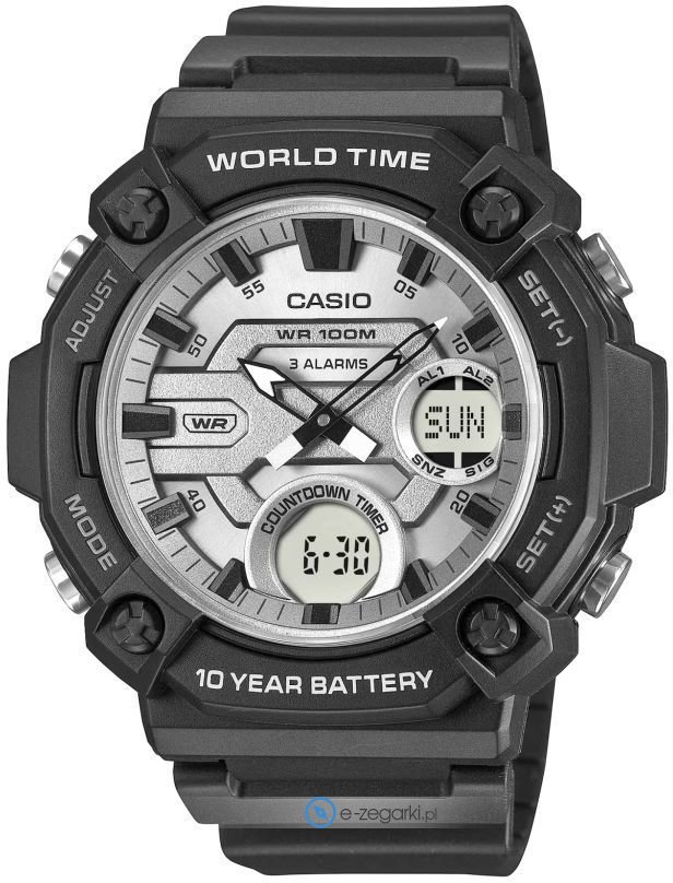 Zegarek AEQ-120W-7A wyposażony jest w mechanizm zasilany standardową baterią kwarcową. Pasek czarnego koloru zrobiony jest z wysokiej jakości tworzywa sztucznego.