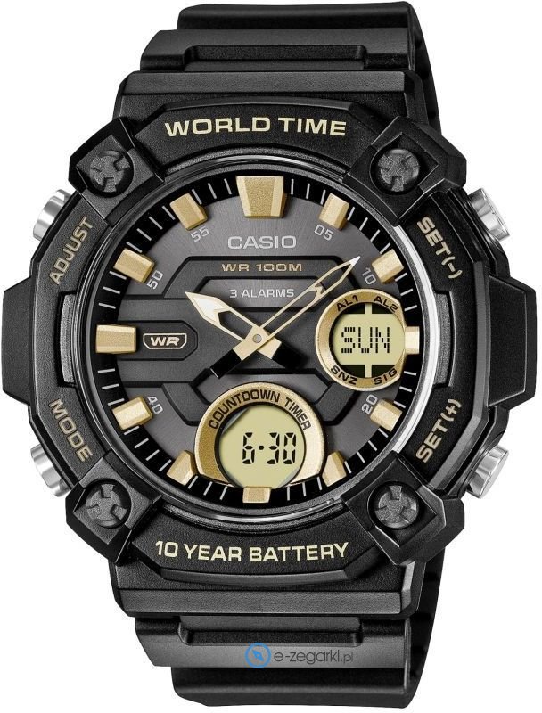 Zasilanie zegarka AEQ-120W-9A to normalna bateria kwarcowa. Pasek koloru czarnego zrobiony jest z wysokiej jakości tworzywa sztucznego.