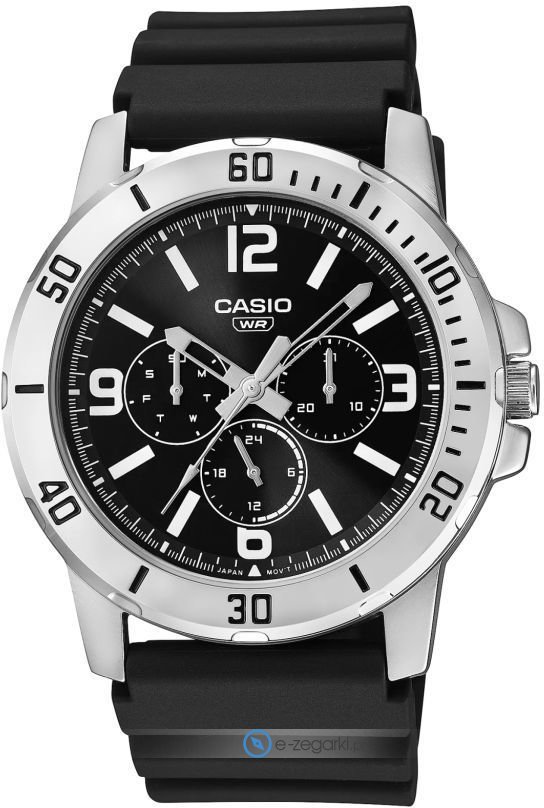 Zegarek męski MTP-VD300-1B marki Casio należy do rodziny Casio Standard Analogue. Ciekawą konstrukcję zegarka osiągnięto dzięki tarczy w kolorze czarnym. Zegarek ten prezentuje aktualny czas w formacie analogowym dzięki czemu odczyt jest bardzo łatwy. Koperta jest w kolorze srebrnym szeroka jest na 49 mm oraz ma grubość 49 mm - w kształcie okrągłym.